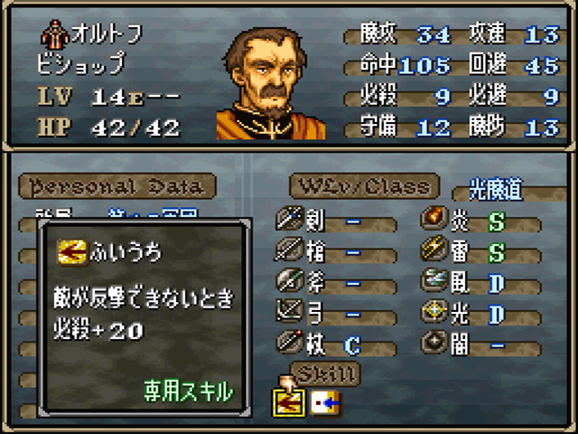 命中を上げてしまうと対抗策がなくなるので、必殺率を上げることにしました。相手が聖戦士の書を持っている場合はこのスキルでの上昇値込みで必殺率が0になるため、オルトフの攻撃範囲に入るユニットに書を持たせるとよいでしょう。